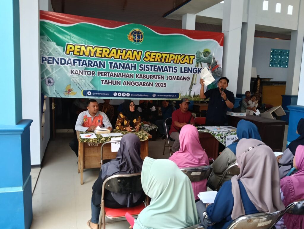 Inside News | Jombang – Kantor Pertanahan Kabupaten Jombang melalui Panitia I Ajudikasi Pendaftaran Tanah Sistematis Lengkap (PTSL) Tahun 2025 kembali menyerahkan hasil program PTSL kepada masyarakat. Kegiatan ini berlangsung di Balai Desa Karangan, Kecamatan Bareng, pada pukul 09.00 WIB, Jumat (10/10).