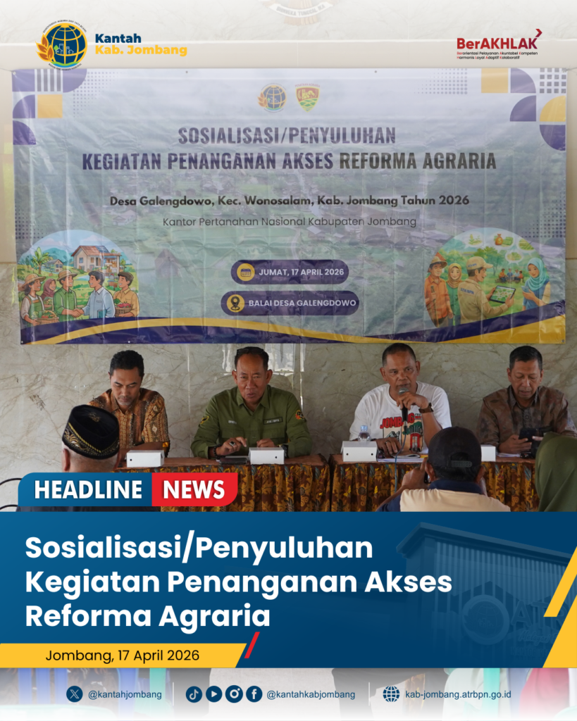 Inside News | Jombang – Kantor Pertanahan Kabupaten Jombang melakukan kegiatan sosialisasi/penyuluhan terkait penanganan akses Reforma Agraria telah dilaksanakan pada hari Jum’at, 17 April 2026, bertempat di Desa Galengdowo, Kecamatan Wonosalam, Kabupaten Jombang. Kegiatan ini menghadirkan perwakilan dari Dinas Koperasi Kabupaten Jombang sebagai narasumber, yang memberikan pemaparan komprehensif mengenai pentingnya penguatan akses Reforma Agraria bagi masyarakat, khususnya dalam mendukung peningkatan kesejahteraan ekonomi berbasis potensi lokal.